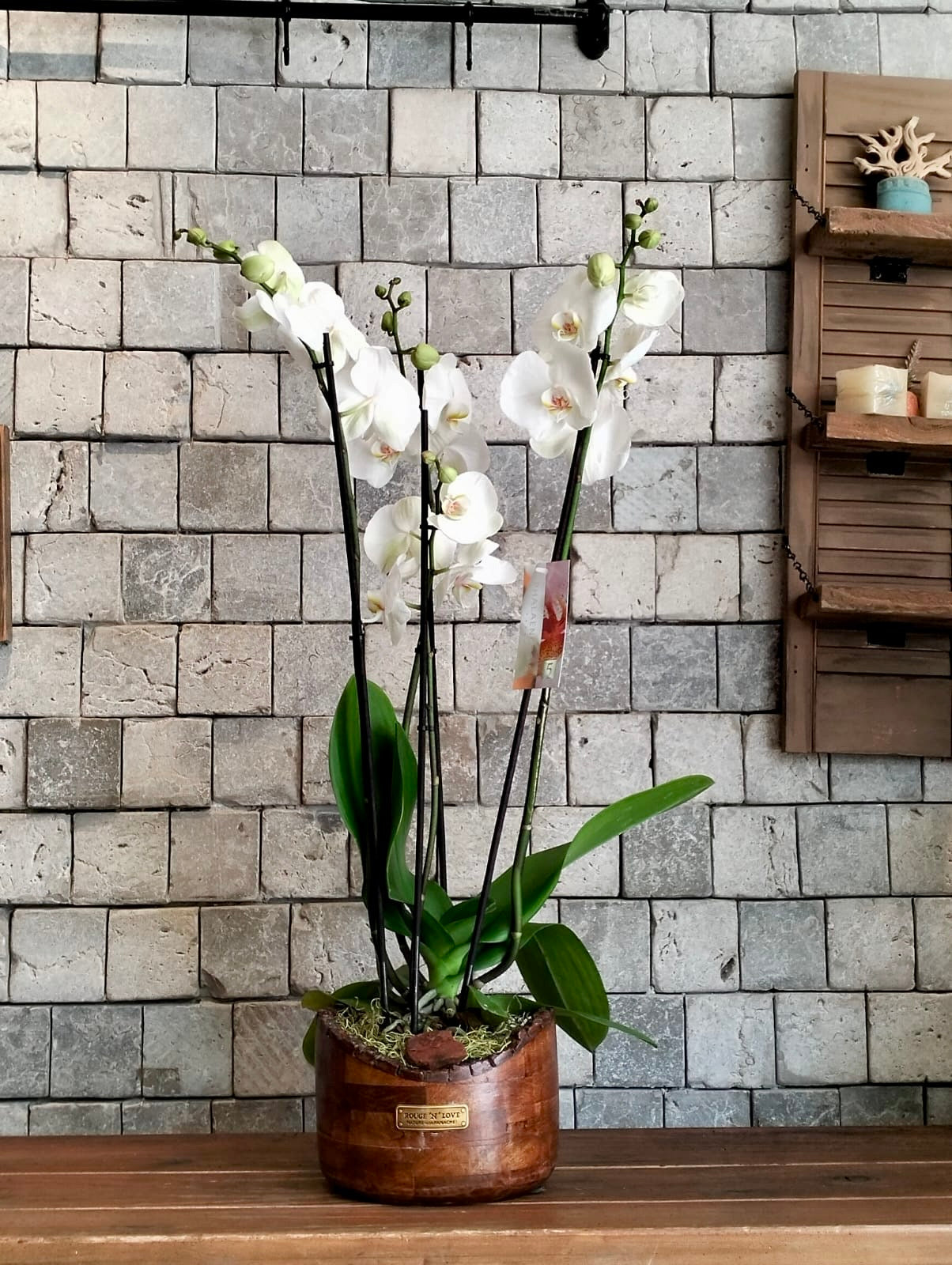 White Eclipse Moon Orchids | Sculpted Indian Wooden Pot