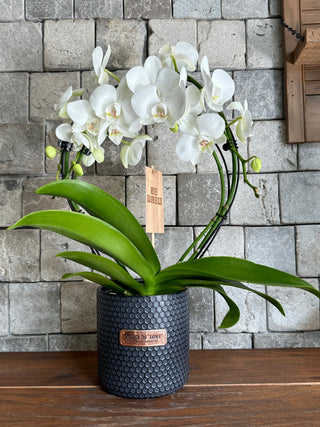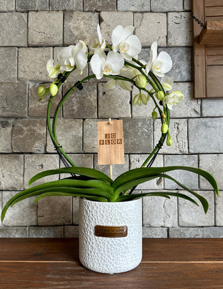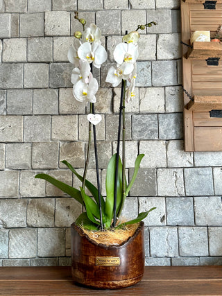 Royal Blossom Moon Orchids | Sculpted Indian Wooden Pot
