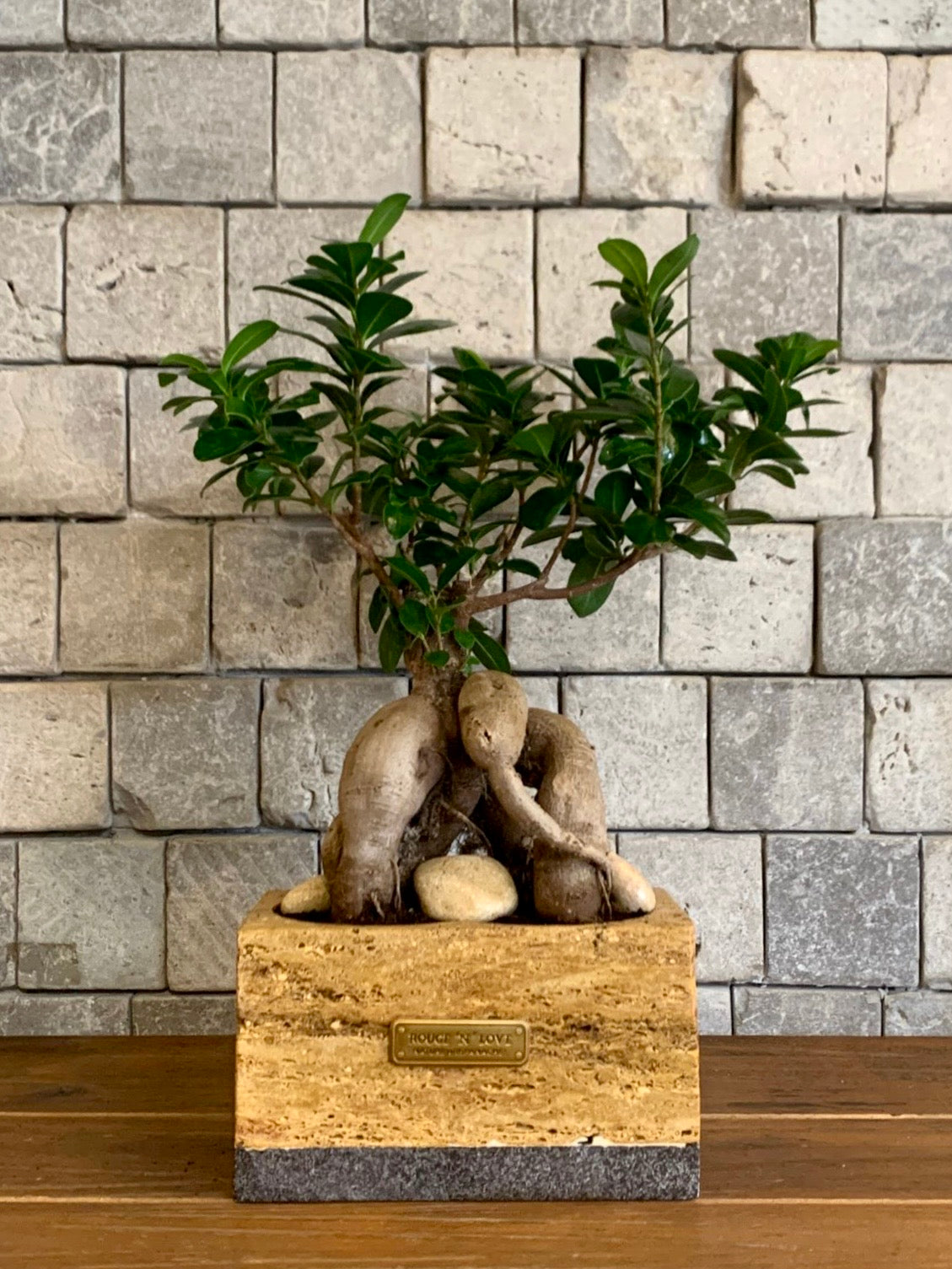 Ginseng: is a Chinese word for 'root'. It takes years to develop the unique shape of the root, after which the small leaved Ficus is grafted onto the root. The plant is pruned with a lot of patience, which develops its Bonsai shape.