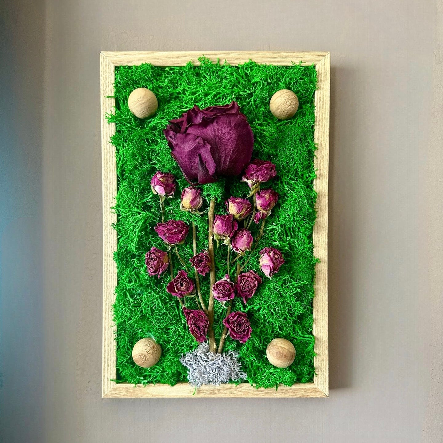 A large infinite rose set on natural moss, accented with delicate dried mini roses—designed to symbolize beauty and emotion that last forever. ☘ Dimensions: 29.5 x 19.5cm ☘ Material: Wood Frame