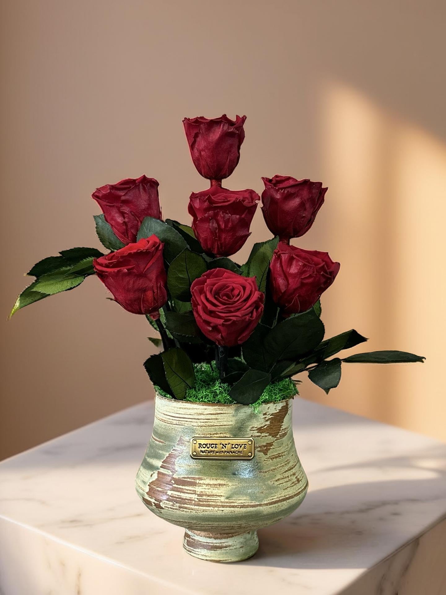 Seven eternal red roses, forever in bloom, rest within an artisan vessel handcrafted from earth and shaped with soul. Each pot carries its own unique texture, radiating timeless elegance and a passion that never fades — a lasting symbol of love, beauty, and unwavering devotion.