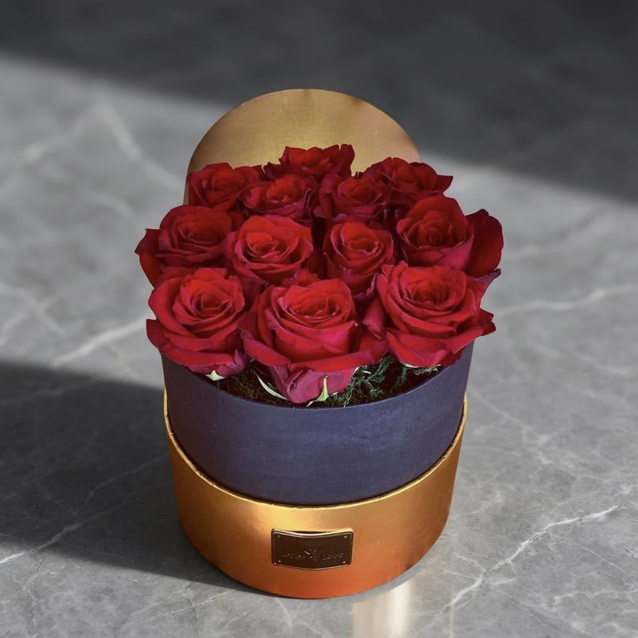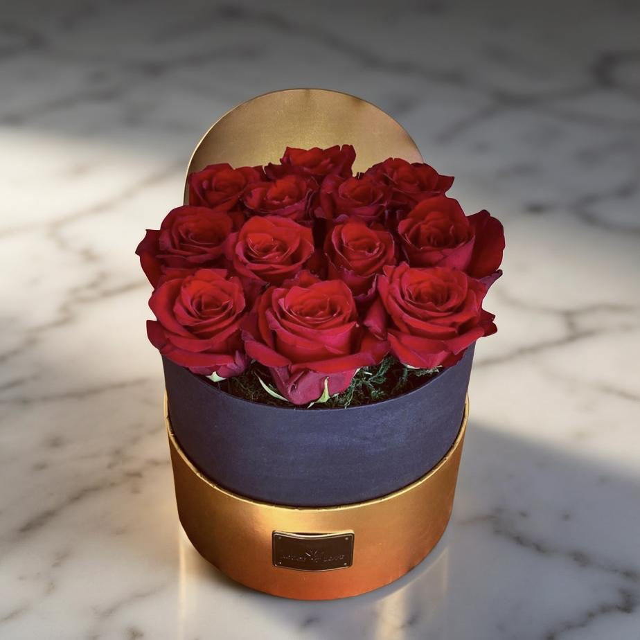 A timeless arrangement of deep crimson roses, set in a refined gold and charcoal box — designed to leave a lasting impression.